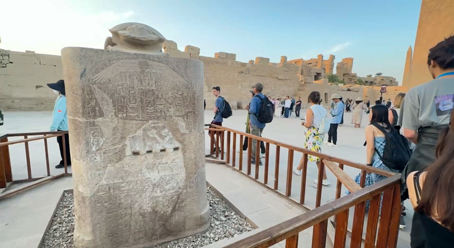 Gölün hemen karşısında ise Karnak’ta en çok ilgi gören noktalardan biri, dev skarabe (bok böceği) heykeli var. Eski Mısır’da skarabe, yeniden doğuşun ve güneşin sembolüydü. Güneşi her gün yeniden doğuran güç olarak görülüyordu.