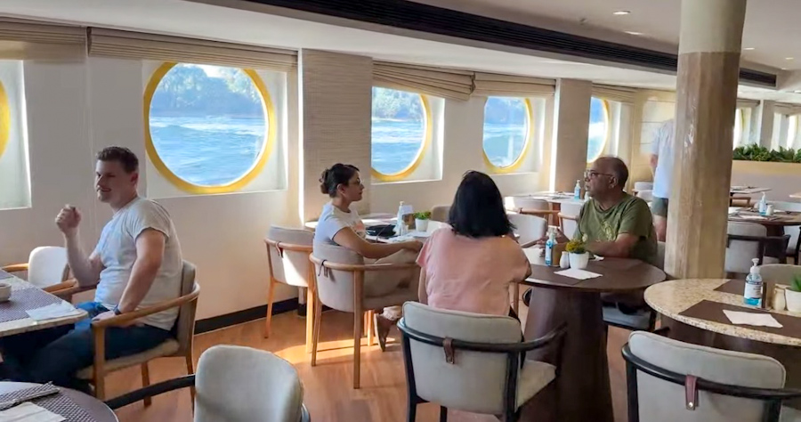 Dokuzda kahvaltıda Dani ve Eli ile buluşacağımız için restorana iniyorum. Restoran deniz seviyesinde, hatta neredeyse camın bir kısmı denizin içinde kalacak.